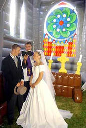 The inflatable church, which holds 60 people standing, was to be dedicated by Michael Elfred, a Church of England minister from Tadworth.